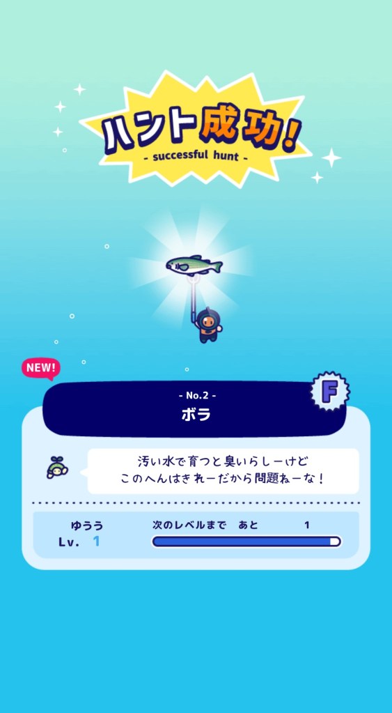 「CRITICAL」「GREAT」「NICE」「BAD」の判定でお魚のHPを無くせばハント成功です。