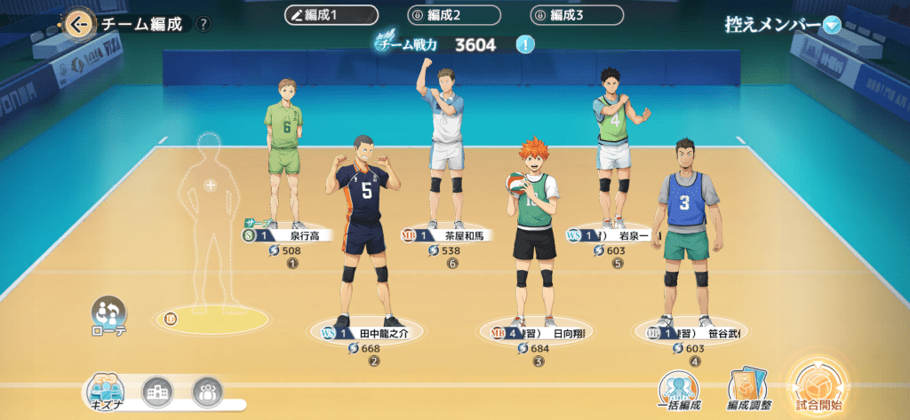 今回の画像は違いますが、最初は主人公「日向翔陽」中学生時代のチームメイトでチュートリアルを進めたいきますが、チュートリアルを終了した後にガチャをして選手を揃えることができるので、楽しみにしていてください。