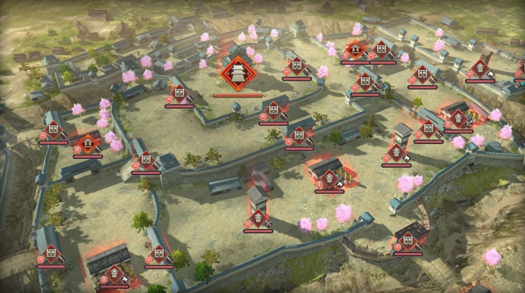 同じ大名の仲間たち「一門」と挑む「攻城戦」は、全国マップとは異なるマップでリアルタイムに行われます。櫓や堀、曲輪から本丸といった日本の城郭を再現したマップになっており、緊張感のある精緻な合戦を繰り広げられて行きます。
