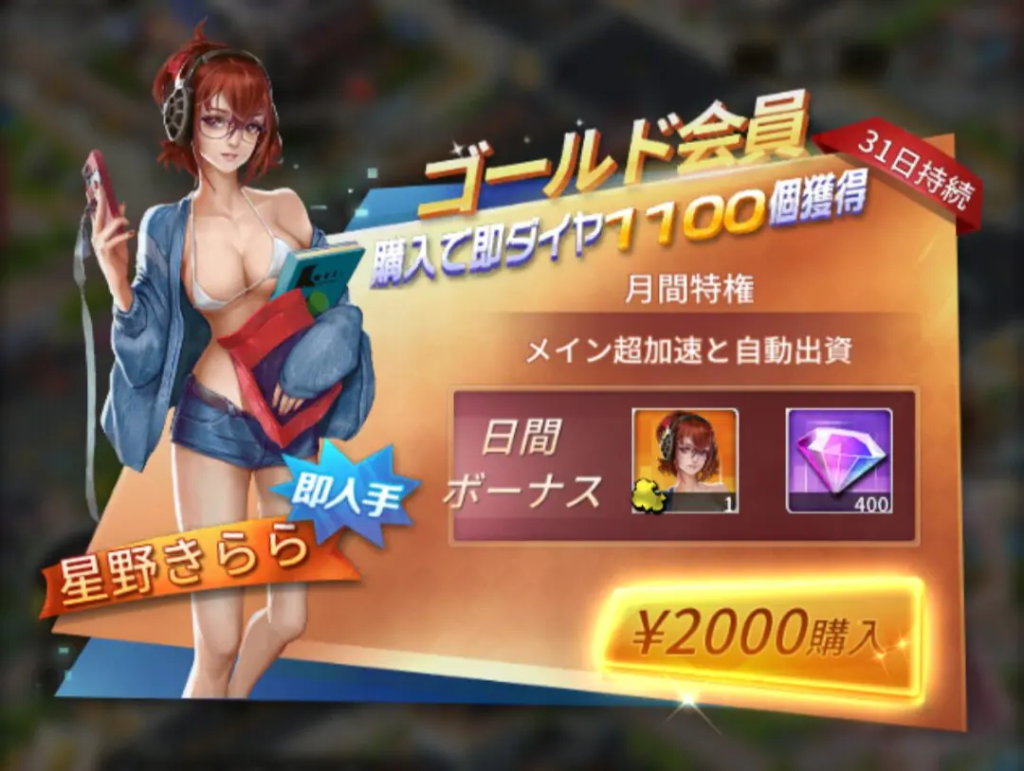 「ゴールド会員」は、31日間にわたってお得なボーナスを受け取れる月額会員です。毎日のログインで「星のきらら(SSR人材)の欠片」や「ダイヤ×400」をゲットできます。