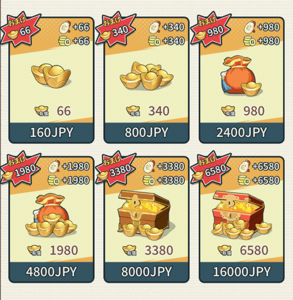課金で購入できるのは、「元宝」と「名声」、「Gポイント」を手に入れることが出来ます。